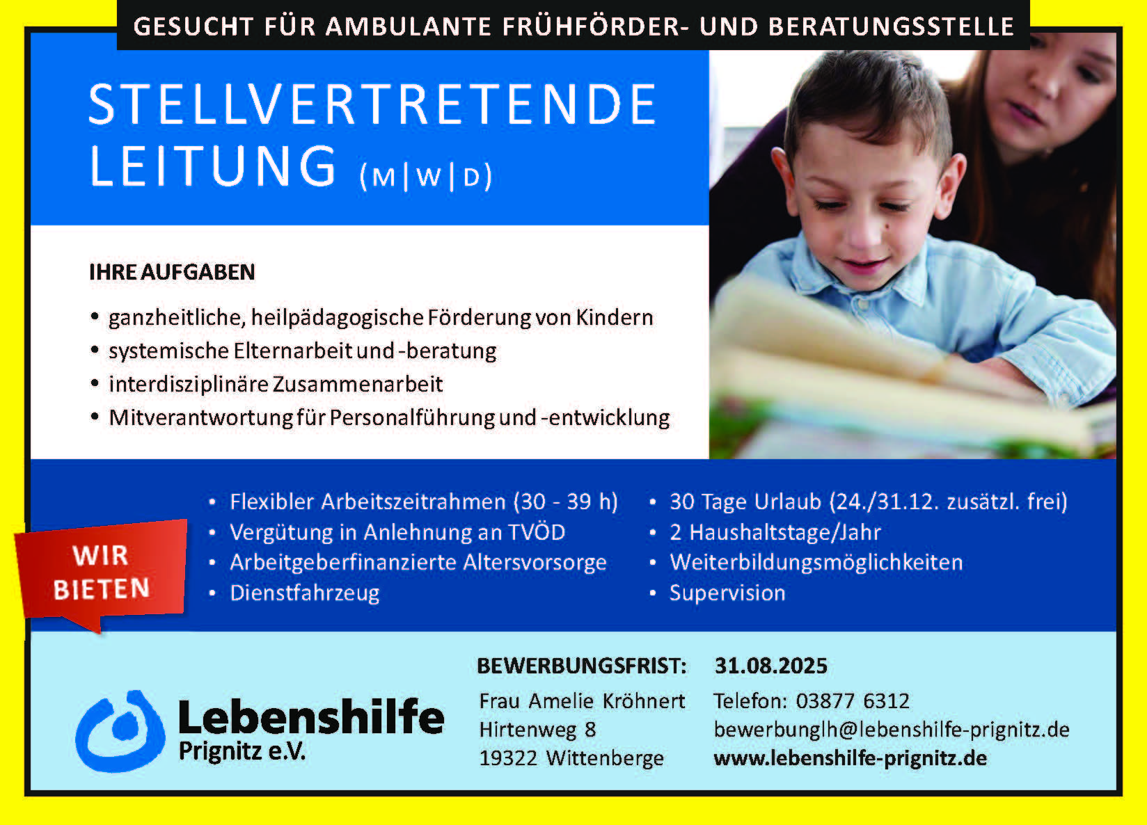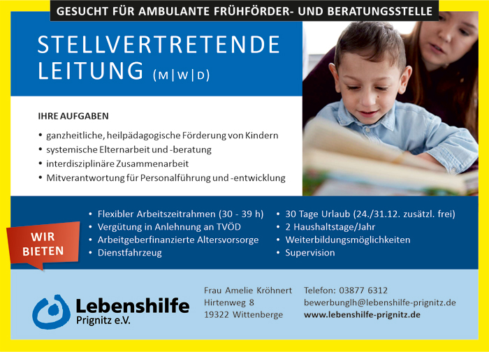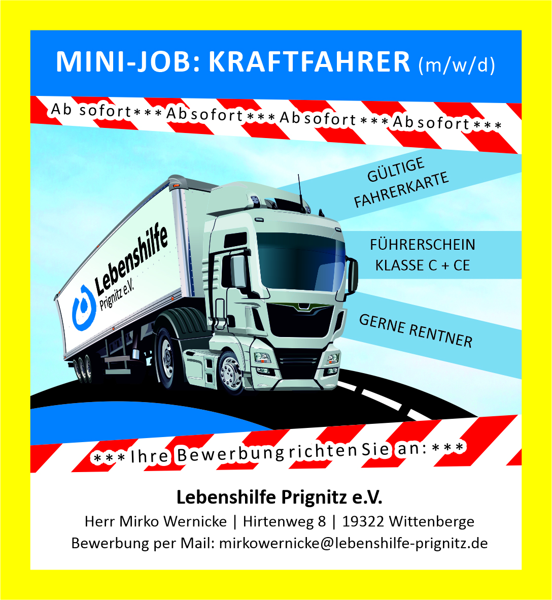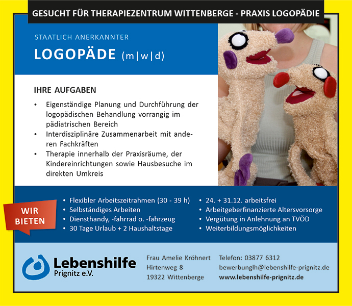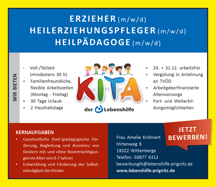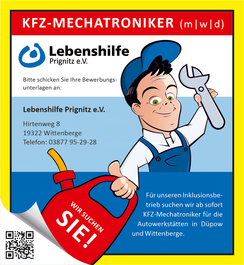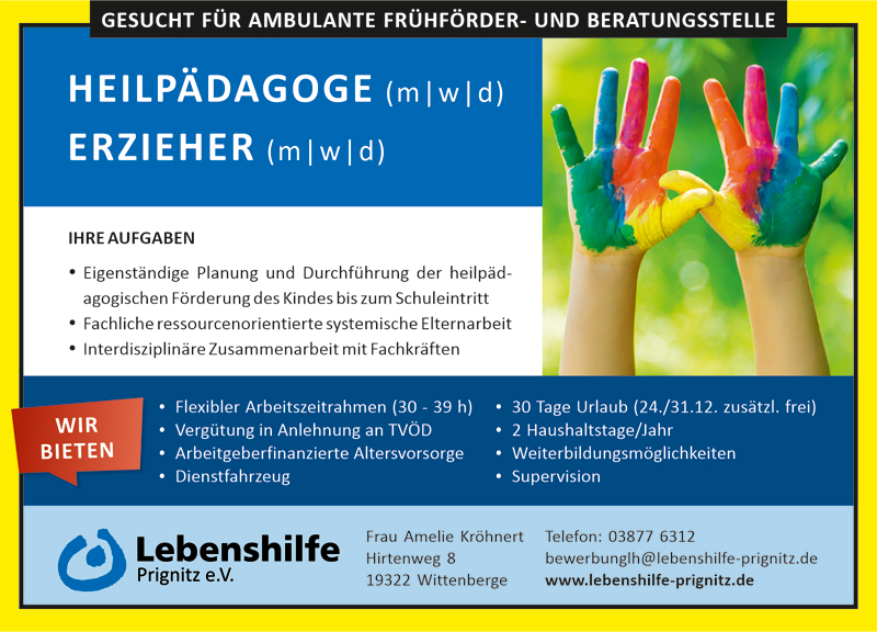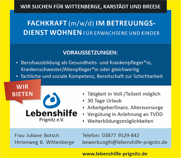 Komm in unser Team und werde "Lebenshelfer" in der Lebenshilfe Prignitz e. V. Ob in unseren Werkstätten für behinderte Menschen, unseren Wohn- und Pflegeeinrichtungen oder in unserer Kita – bei uns findest du DEINEN Job. Seit über 30 Jahren sind wir als soziales Unternehmen in der Prignitz aktiv. Wir stehen für Fachwissen, Leidenschaft und Freude an der Arbeit - für kleine und große Menschen mit und ohne Behinderungen – "sympathisch anders" halt.